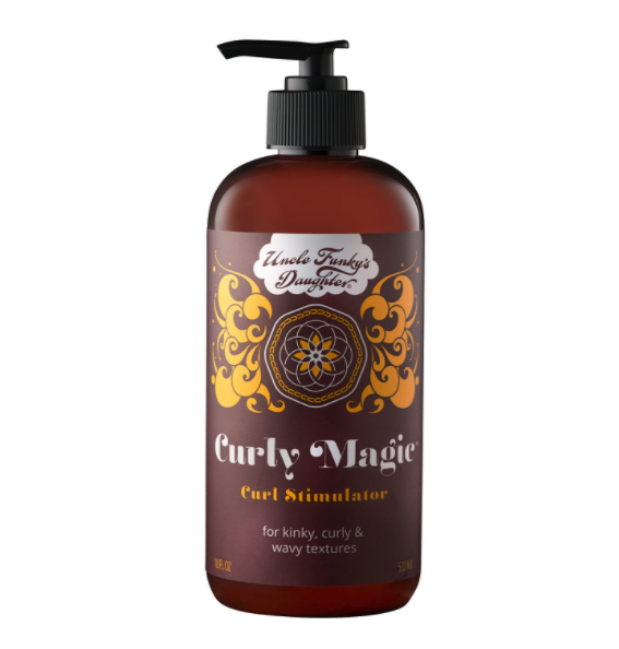 Uncle Funkyβs Daughter Curly Magic Curl Stimulator. This is the holy grail and the best curly hair styling product I have ever used. For some reason, I retired it for a bit (I will claim temporary insanity if ever taken to court on it) but was gleefully reminded of it when I saw my hairstylist at the end of April. It is everything. It smells great, the consistency of the product is great, and IT WORKS. It holds and defines your curls so well and completely lives up to the βmagicβ in its name. Depending on how thick or thin your curls are, you should play around with how much you use. My curls are on the thinner side, and I use about 2 full pumps and scrunch it throughout my hair* right after I give it those 1-2 dry pats.