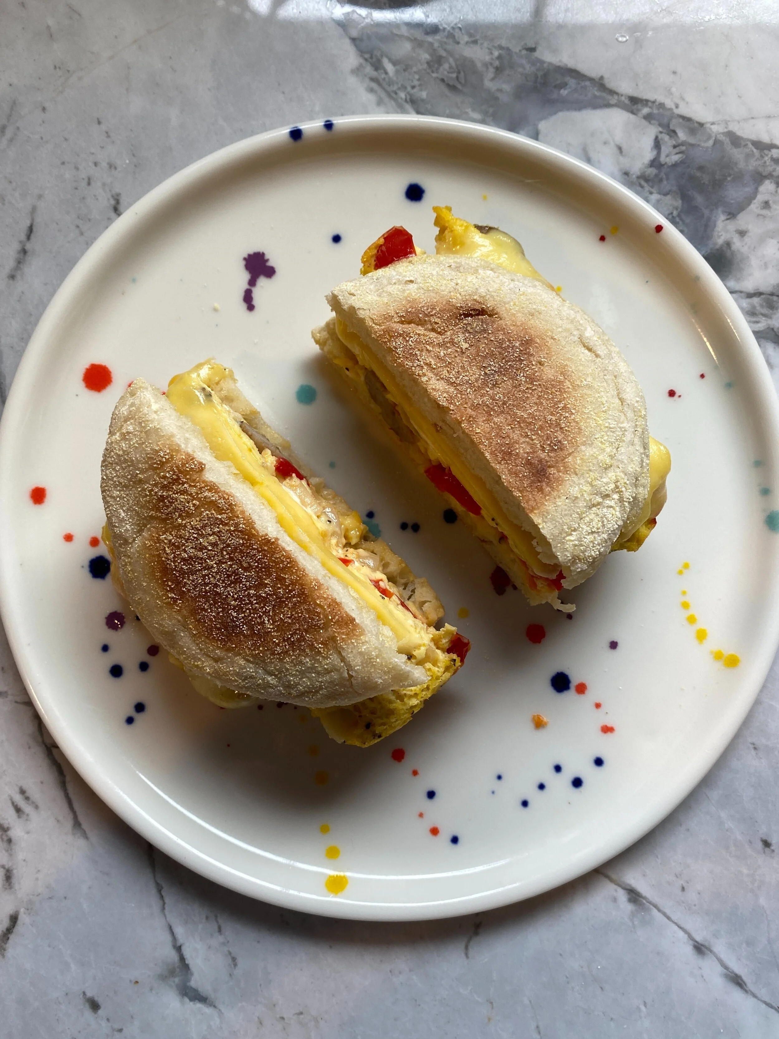 To save for later, DO NOT TOAST the muffins. Simply wrap each sandwich up individually in plastic wrap or foil and store in the fridge or freezer, depending on how long you want to hold onto them. To reheat from the fridge, unwrap the sandwich and microwave until it’s heated through, then finish it off in the toaster oven for some crisp. If reheating from frozen, microwave for 2 minutes, flipping it halfway through.