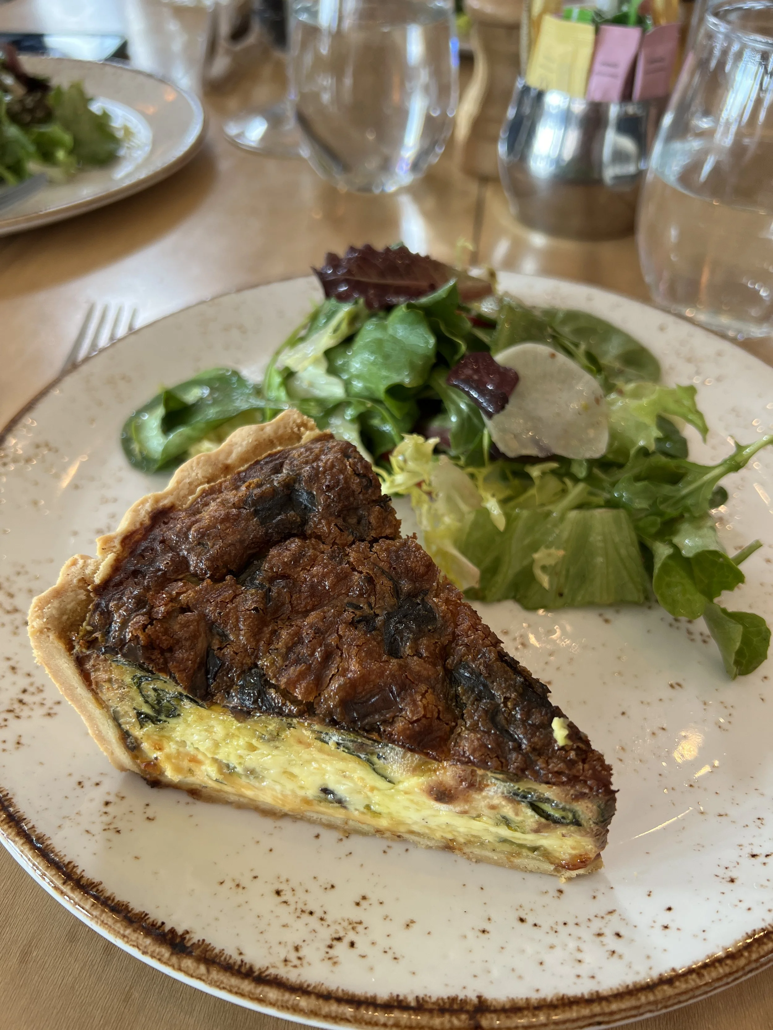 A perfectly dressed side salad with quiche