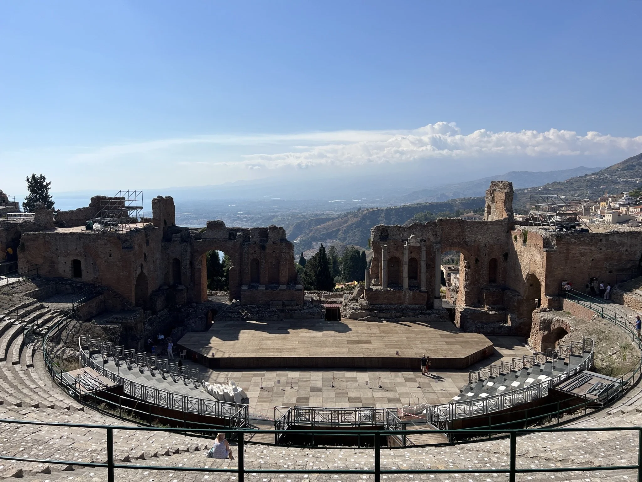 After a good night’s rest, we woke up the next morning and spent the day exploring the town and visiting the ruins of Teatro Antico di Taormina, the Greek Theatre of Taormina. Built in the 3rd century B.C., this theatre was intended for performances, both acting and musical and was “updated” during the Roman Empire to host games and gladiator battles. It is still used today for concerts; in fact, Olivia Muenter saw Paolo Nutini there this summer. We were praying there would be a live show when we were in town, but sadly there wasn’t. Knowing that this ancient structure used to seat up to 10,000 spectators was mind-boggling to me. In fact, most everything we saw in Italy made my brain soupy and scrambled. I kept saying “I don’t understand” about most every site we saw. It’s hard to comprehend that you’re looking at ORIGINAL ruins and structures from THOUSANDS of years ago. Yes, many parts of these sites have been rebuilt in an effort to replicate the original, but so many are the OG and that seemed to be too much for my brain to compute.