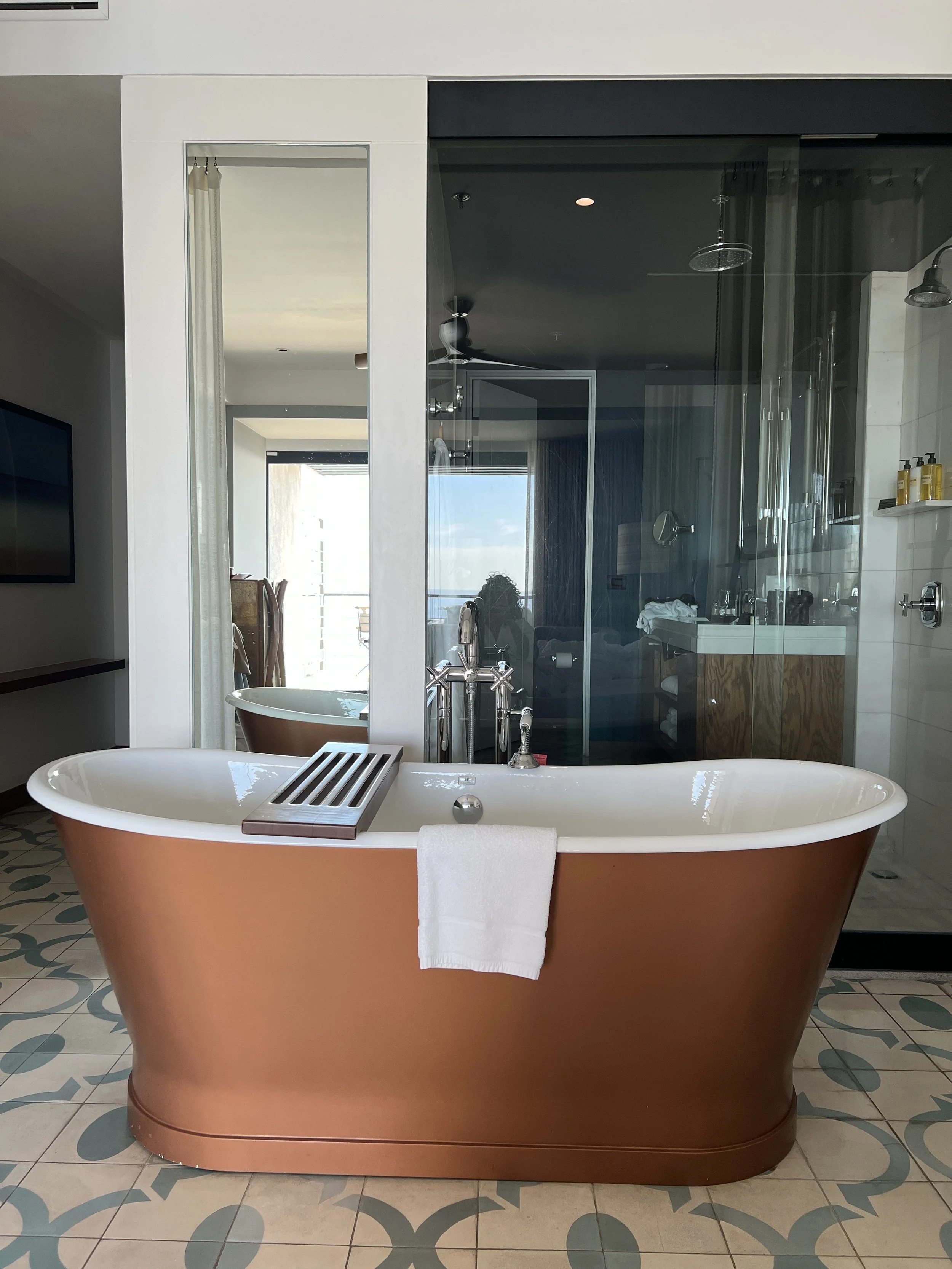 The general vibe at The Cape was sleek and modern. I personally love more character and color when it comes to my hotel stays, but I admit the neutral and blue shades within our room were very calming and mirrored our immediate scenery. The bathroom was beautiful with a walk-in shower complete with two shower heads (one being a rainfall shower head, my dream) and an elegant soaking tub placed between the shower and the bed. Yes, you read that right.