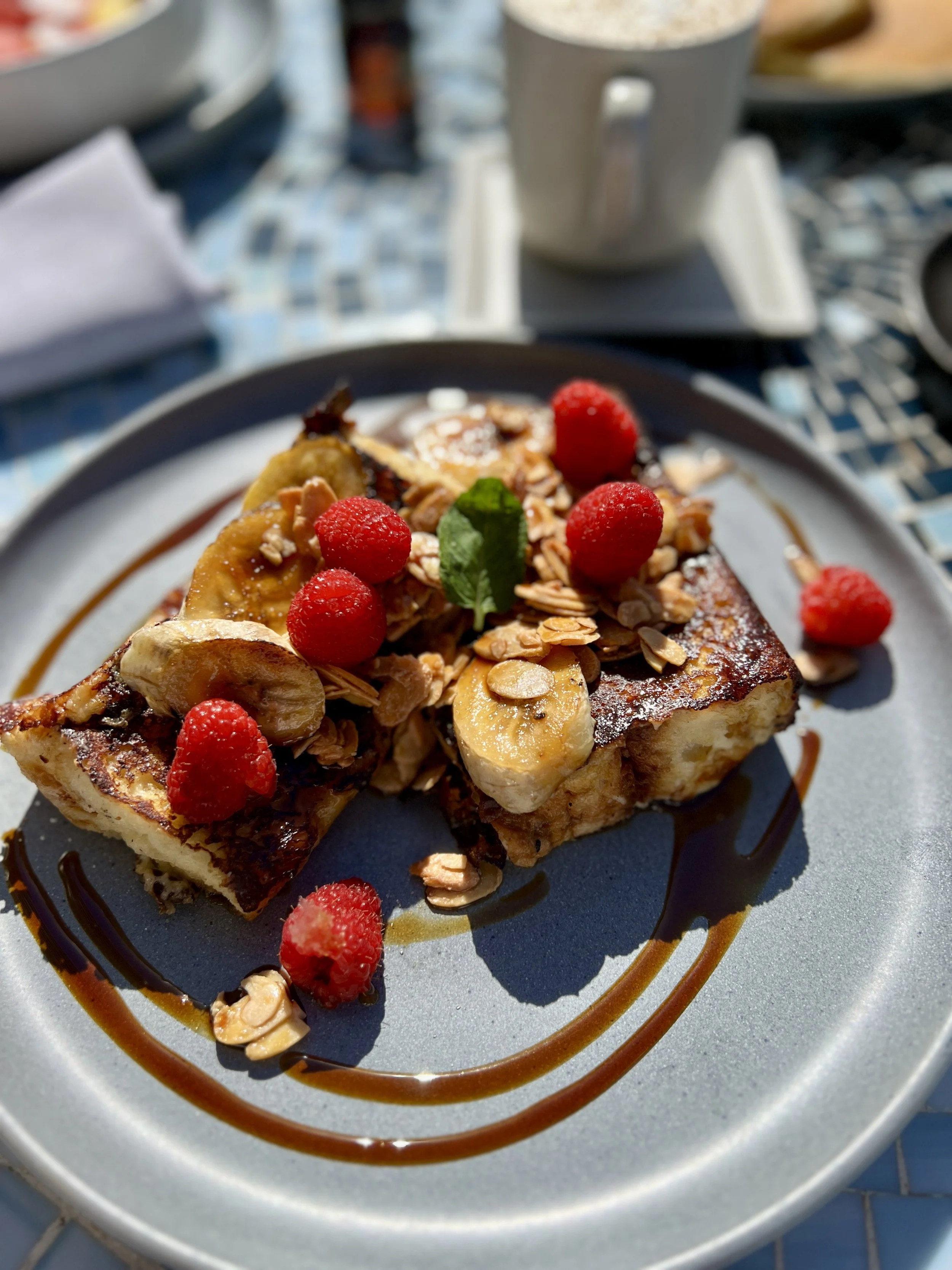 The Ledge is what we had for breakfast all three mornings, and it was just okay. The coffee was incredible, but the food was fine? Maybe we just didnβt order the right stuff, but we werenβt blown away with the flavors of any dish we got except for their take on French toast, which was fucking incredible and came with roasted bananas, almonds, caramel sauce, raspberries, and charred vanilla whipped cream.